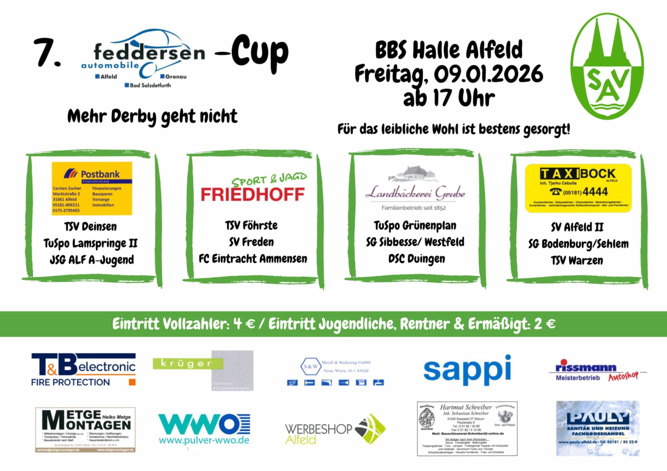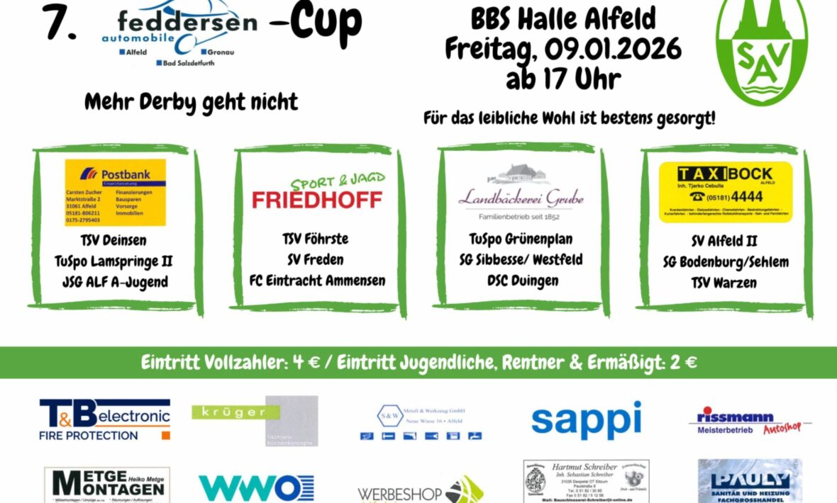 Hallenfußball-Fans aus der Region dürfen sich auf einen stimmungsvollen Fußballabend freuen: Am Freitag, den 9. Januar 2026, richtet die SV Alfeld in der BBS-Halle Alfeld den 7. Feddersen Automobile Cup aus. Der Turnierstart ist für 17.00 Uhr angesetzt, die Siegerehrung ist gegen 22.00 Uhr geplant.