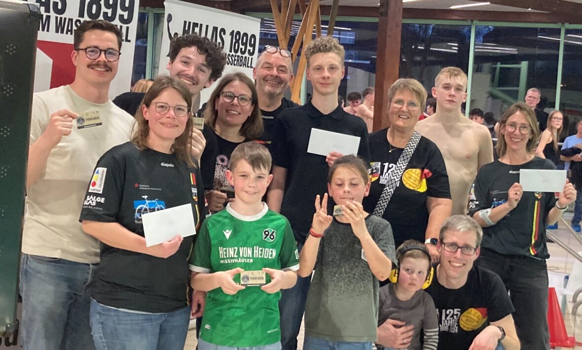 Acht ihrer Fans verließen nach der letzten Heimspielparty das Wasserparadies als doppelte Sieger. Sie räumten nämlich beim Gewinnspiel ab, das der Klub erstmals ausgeschrieben hatte. Aber der Reihe nach. Zuerst sorgten Trainer Dirk Schütze und das Team für lauten Jubel. Vor eigenem Publikum ließen sie dem HTB 62 Hamburg beim 16:11-Erfolg kaum eine Chance, holten souverän die drei Punkte. In der Pause bedankten sich Co-Trainer Roland Weiterer und Schatzmeister Marcel Sukop im Namen des Fördervereins Wasserball bei Marc Suray, Geschäftsführer der Calix GmbH, die diese Heimparty präsentierte. Ein großer Dank ging auch an die anderen Sponsoren, die das Team unterstützt haben. Dazu gehören die Sparkasse Hildesheim Goslar, die Hanomag, die Apotheke im medicinum, das Jim & Jimmys, das Helios Klinikum, Glas Salge, Bismark Architektur, die Autovermietung Yellow Car, Daniel Kunzfeld Fotografie, die Württembergische Versicherung Josip Novacic, Death by Pizza, das Wasserparadies Hildesheim, die Thorsten Schütze Planungsgesellschaft und der Stadtverkehr Hildesheim. Sie alle trugen dazu bei, dass der Hellas-99 in der Gruppe B der U18-Bundesliga mitmischen und bei jedem Heimauftritt eine Wasserball-Party feiern konnte. Zur Freude trug auch der frühere Oberliga-Wasserballer Burkhard Ludwig bei, der dem Verein und dem Team eine 800-Euro-Spende überreichte. Das Geld hatte er auf seinem 80. Geburtstag gesammelt. Er gehörte zusammen mit der früheren Vorsitzenden Frauke Oppelt-Brager, dem heutigen Vorsitzenden Jan Heinemann und dessen Sohn Jonte sowie dem U18-Kapitän Laurits Bauckholt zu den Glücksboten. Sie fischten die Karten der Gewinner aus der Lostrommel. Den Hauptpreis, einen 250-Euro-Gutschein für das Wasserparadies, räumte Laura Vignolo ab, ein 150-Euro-Gutschein für das Wasserparadies ging an Dominic Zapotoczny, und den 50-Euro-Gutschein für das Wasserparadies steckte an Sarah Schwab ein. Über jeweils einen 20-Euro-Gutschein für das Restaurant Death by Pizza durften sich Florian Weiterer, Lukas Schwab, Julia Schütze und Henk Telle freuen
