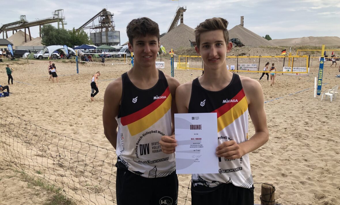 Felix Machel und Bennet Pommerening starteten bei den Jungs ebenfalls gut ins Turnier. In Ihrem Pool-Play gewannen sie Spiel eins gegen Müller/Zaitsev (Schwenningen/Freiburg) mit 2:1. Im zweiten Spiel gegen die an Nummer 2 gesetzten Hikel/Weissenbach verschliefen die GRIZZLYS Satz eins komplett und verloren mit 5:15. Im zweiten Satz lief es besser, aber die Jungs verloren mit 10:15. Damit in der Zwischenrunde, gelang dem Team erneut ein wichtiger Sieg, um schon unter den Top 16 zu landen. Gegen Lepski/Pfeifer aus Leipzig gewannen sie mit 2:1 und sicherten sich somit das obere Tableau. Im nächsten Spiel sollte sich das Blatt allerdings wieder wenden und die Jungs rutschten durch eine 0:2 Niederlage gegen Filippidis/Reckeweg (Bad Kreuznach/Düsseldorf) in die Verliererrunde. Dort setzten sie sich gegen das Duo Metzen/Vilkner (Bad Kreuznach/Mainz) in einer engen Partie mit 15:10 und 15:13 durch. Gegen das Duo Forschner/Sprenger aus Rottenburg war dann in der nächsten Runde nach einem 0:2 allerdings Endstation. Damit steht am Ende Platz 9 und damit die erste Top 10 Platzierung eines Jungenteams bei einer Deutschen Meisterschaft.