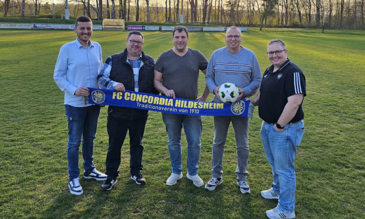 Bildunterschrift: Die Verantwortlichen des FC Concordia Hildesheim freuen sich riesig auf dieses Event und möchten sich als hervorragenden Gastgeber für alle Fußballbegeisterten zeigen. Auf dem Bild sind von links nach rechts: Danino Laubinger, Meik Möhle, Kreisfußball-Chef Andreas Wiese, Siegmund „Tino“ Laubinger und Spielausschussvorsitzende Isabell Hartmann. Text+Foto: Miguel Rey Lamas