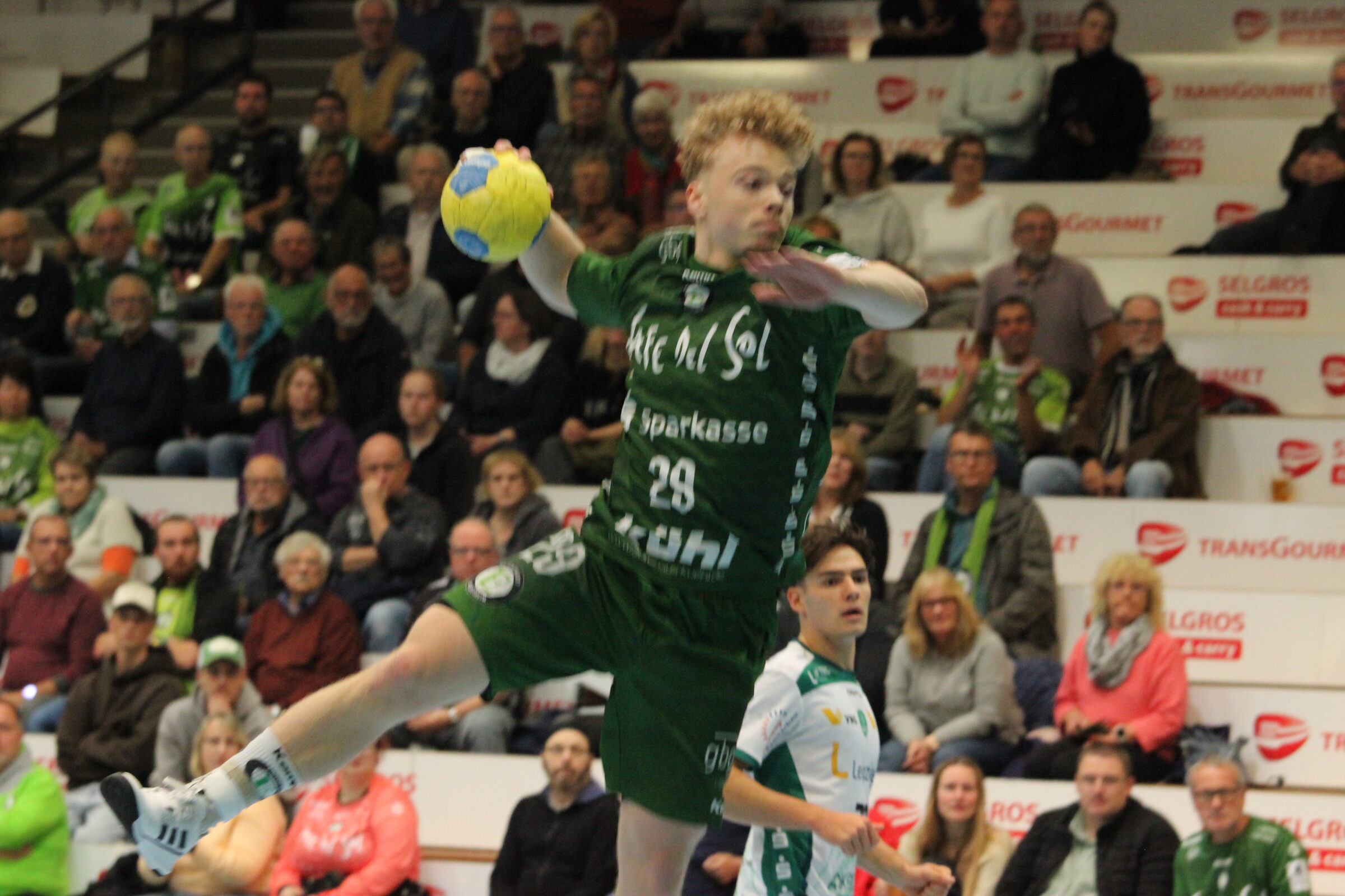 Tjark Jonas hatte zum Ende der ersten Halbzeit auch noch einen umjubelten Auftritt. Nach einer erneuten Parade Guretzkys verschwand der Ball unter dem Hallendach. An Ersatz hatte die Spielleitung scheinbar nicht gedacht. Also sprintete Jonas in die Kabine und beschaffte zwei neue Spielgeräte, sehr zur Freude der Fans. Apropos Fans: Hallensprecher Christoph Scholz begrüßte offiziell 912 Besucher in der Sparkassen-Arena. Grob geschätzt waren aber allenfalls 760 Fans in der Halle. „Das liegt bestimmt an den Herbstferien“, ergänzte Scholz.