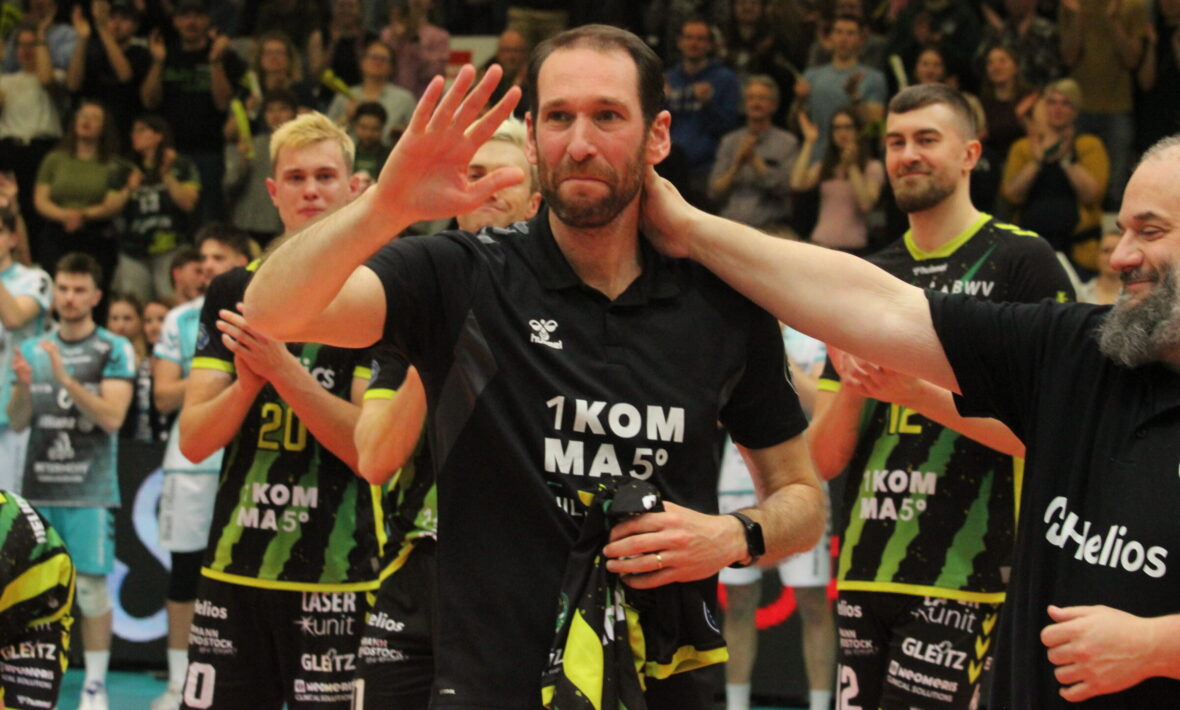 Im zweiten Satz Waren die Gäste weiterhin besser im Spiel, allerdings steigerten sich die Grizzlys mit zunehmender Dauer. Aus einem 5:7-Rückstand machten die Giesener eine 14:12-Führung. Der Satz blieb bis zum Ende spannend, weil Canham mit seinen Aufschlägen immer wieder Stress in der Giesener Annahme erzeugte. Beim 18:20 sah es nicht gut für die Giesener aus, aber Rura, Kessel und Lars Migge drehten das Momentum wieder auf die Seiten der Grizzlys, die den zweiten Durchgang mit 25:23 gewinnen konnten. Im dritten Satz hatten die Gäste wieder lange Zeit die Nase vorne. Beim Stand von 5:6 kassierte Dürens Trainer Christophe Achten wegen Meckerns die rote Karte und es stand 6:6. Die Grizzlys konnten diesen Vorteil nicht nutzen und Düren führte mit 14:11. Am Ende des Satzes hatten die Powervolleys sogar zwei Satzbälle. Dann schlug Mark Rura aber so gut auf, dass die Grizzlys den Satz noch drehen konnten. Mit 26:24 ging der Durchgang doch noch an die Grizzlys. Die 2304 Fans in der Sparkassen-Arena waren aus dem Häuschen. Die Grizzlys nahmen sich aber Mitte des vierten Satzes eine folgenschwere Schwächephase und Düren ging mit 22:17 in Front. Zwar konnten die Grizzlys nochmals auf 23:24 verkürzen, aber Dürens Kapitän Poole machte den Sack schließlich zu. „Well done“, dachte sich der Ire beim verwandelten Satzball. Der Tiebreak musste also die Entscheidung bringen. Und wieder gerieten die Hausherren schnell in Rückstand. Beim 1:4 hatten einige Fans schon ein mulmiges Gefühl, aber die Grizzlys kämpften sich zurück. Beim Stand von 13:14 wehrten sie den ersten Matchball souverän ab. Beim Stand von 15:16 gelang Düren aber ein Ass und die Partie war zugunsten der Gäste mit 3:2 entschieden. Für die Grizzlys bedeutete das das Saisonende. Die Giesener sind im Viertelfinale ausgeschieden und für Trainer Itamar Stein endete die zehnjährige Tätigkeit in Giesen mit einer unglücklichen Heimniederlage. „Es waren zehn schöne Jahre und wir haben hier viel aufgebaut“, sagte der Coach unter Tränen. Neben Stein wurden auch fünf Spieler (Yannik Ahr, Austin Wilmot, Mark Olsen, Miguel Sinfronio und Mark Rura verabschiedet. Alles dazu gibt es in einem Extra-Artikel.
